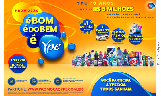 "É Bom. É do Bem. É Ypê". Este é o mote da nova campanha, a maior promovida neste ano pela empresa de produtos de limpeza e higiene. Além do prêmio final de R$ 1 milhão, consumidores poderão concorrer a 7 carros e 4 mil vouchers no valor de R$ 1 mil cada.