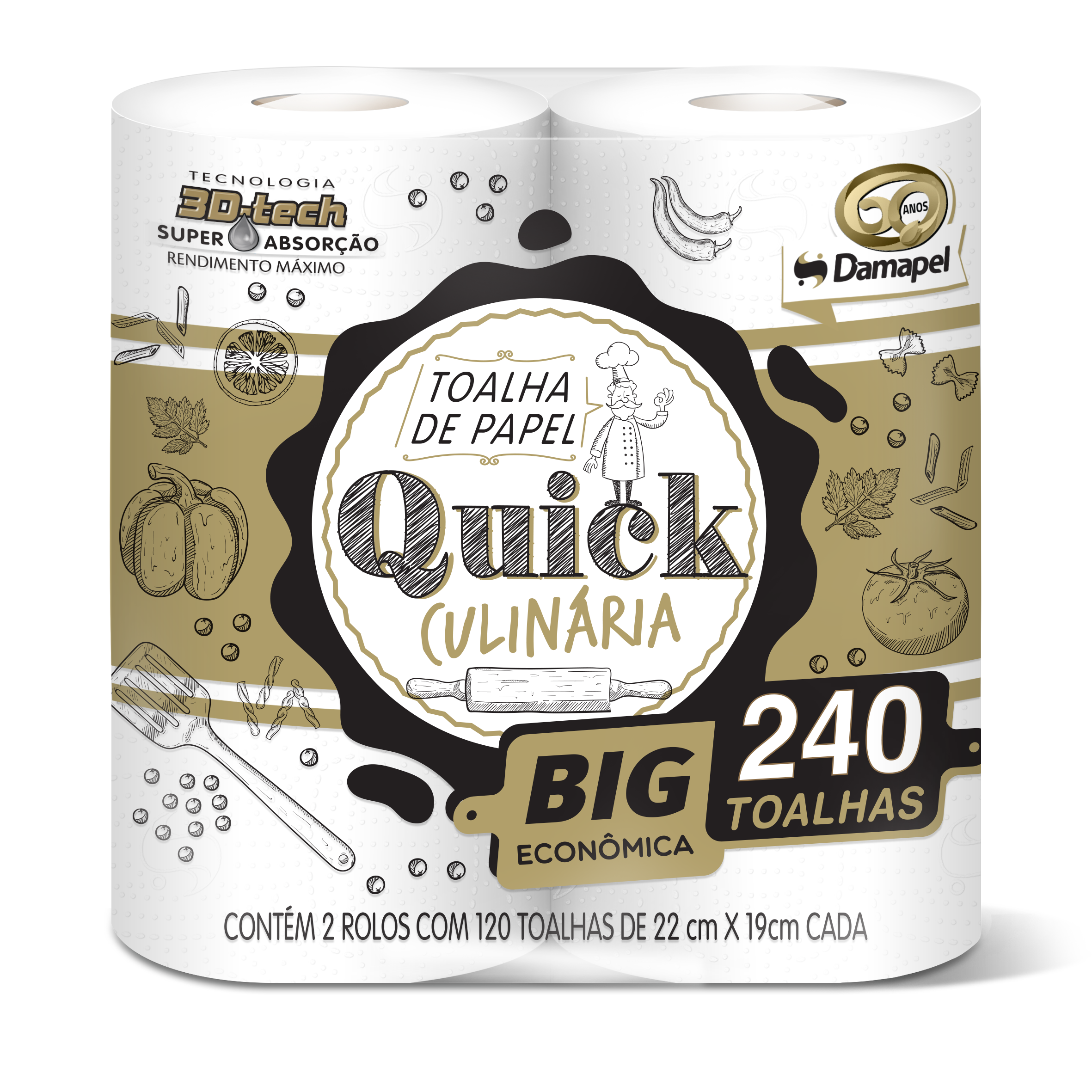Já a versatilidade dos produtos Quick garantem máxima absorção, graças à tecnologia 3D tech. Além das toalhas de papel – comercializadas em embalagens de 240 folhas (2 rolos) e de 360 folhas (3 rolos) –, Quick também marca presença com três tamanhos de guardanapo para momentos diferentes, desde o dia a dia até celebrações especiais.