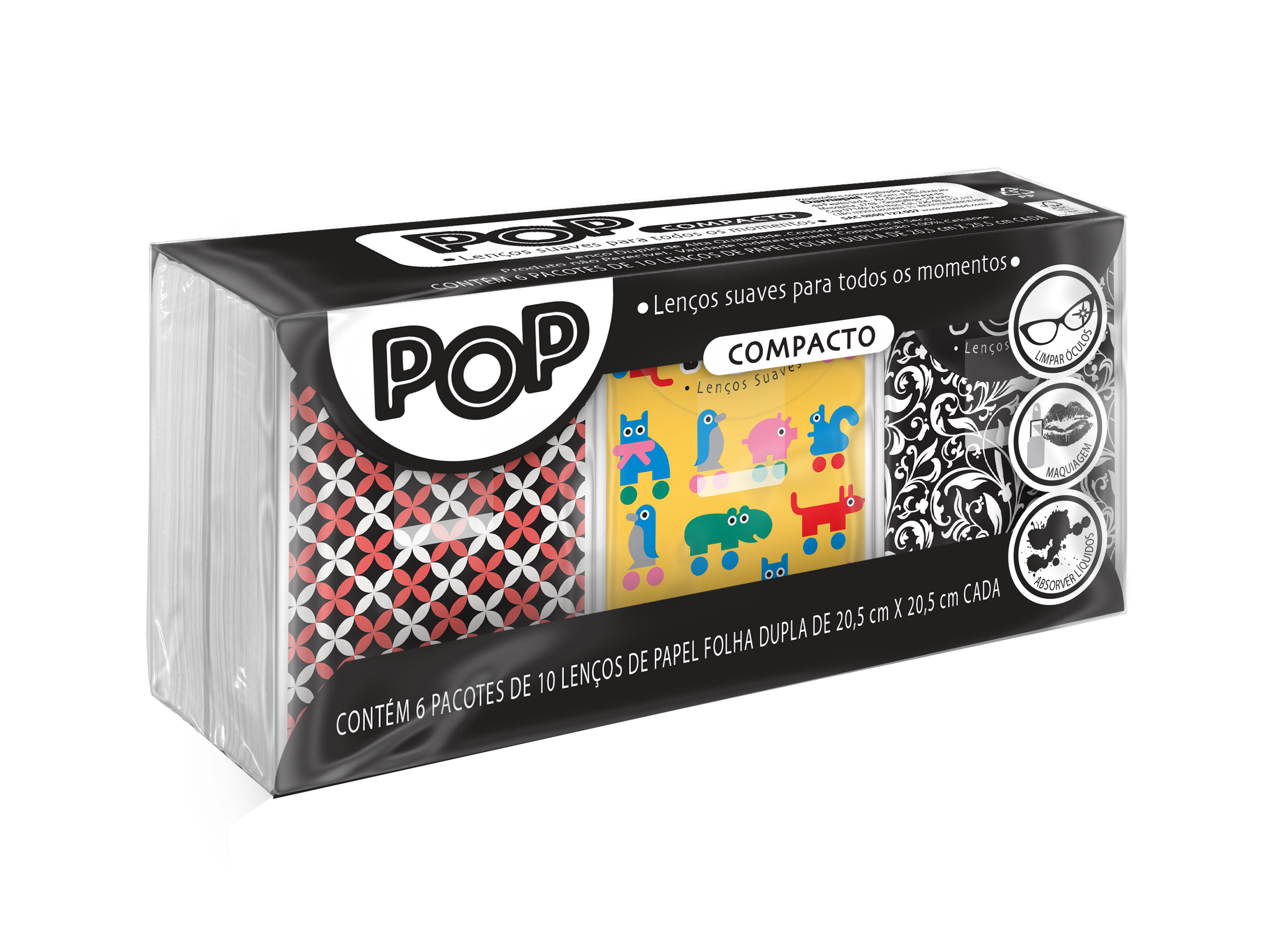 Completam o portfólio os lenços de papel Pop, que compõem mix do varejo, cabem em qualquer lugar e ajudam a ampliar a cesta de compras do shopper. Com embalagens em oito diferentes estampas, são vendidos em dois tamanhos: um formato compacto e outro de bolso.