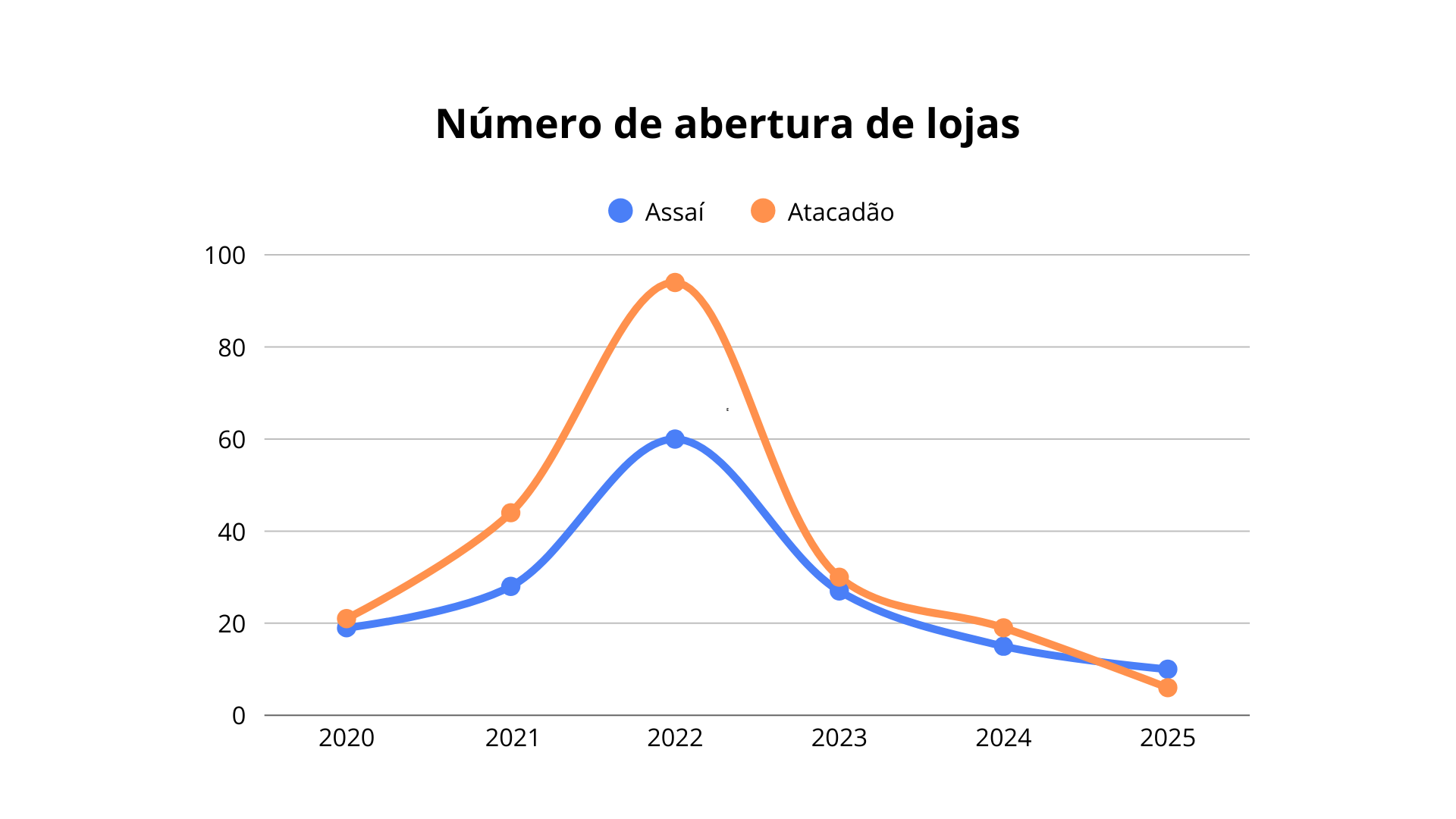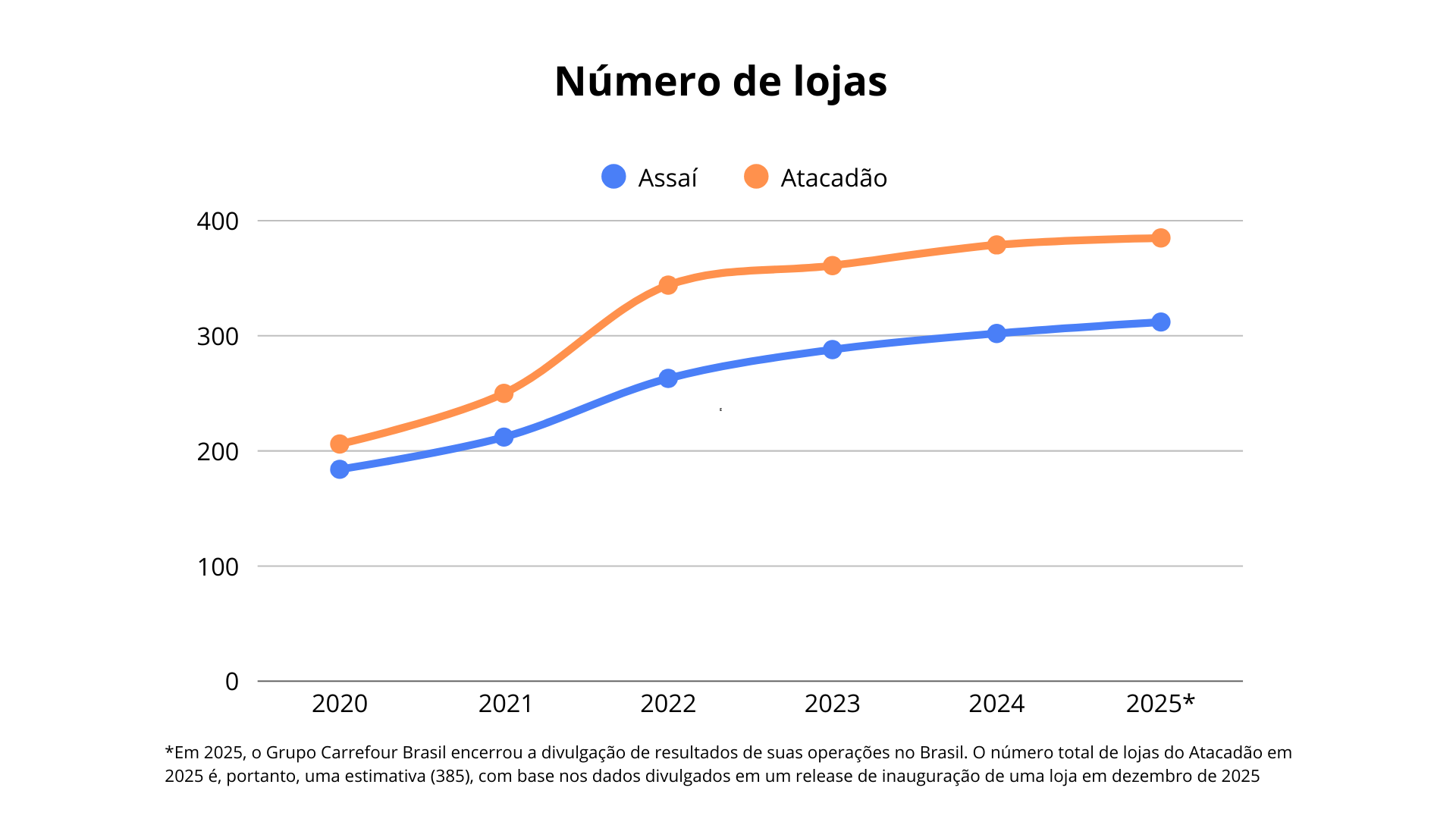 No entanto, entre 2023 e 2024 foram abertas 49 unidades, uma expansão mais desacelerada que teve como um dos fatores relevantes a conversão de lojas de varejo do próprio grupo para o formato atacarejo. Em 2025, o Carrefour Brasil fechou seu capital no país e deixou de divulgar resultados detalhados. Ainda assim, a estimativa é de que cerca de 6 lojas do Atacadão tenham sido inauguradas com base em releases divulgados pela companhia, incluindo a abertura de uma unidade no início de dezembro do último ano. Totalizando assim, 55 lojas abertas entre 2023 e 2025.