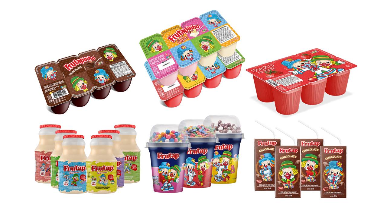 A linha infantil da Frutap é composta por 5 subfamílias e 9 SKUs. A parceria com a dupla Patati Patatá inclui essas categorias e versões: leite fermentado, iogurte polpa, iogurte com confeitos, achocolatado UHT, sobremesa láctea de chocolate, queijo petit suisse com preparado de morango, além da versão com preparado de morango e maçã com banana.