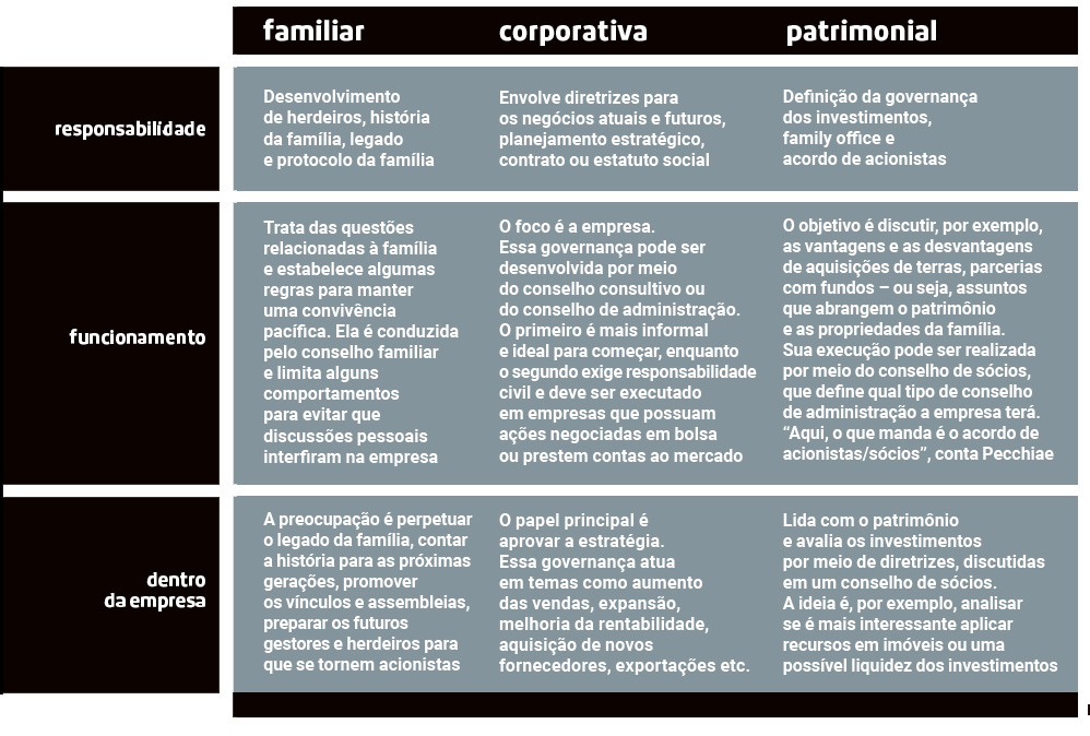 Diante desses desafios, Rodrigo Pecchiae, especialista em governança de empresas familiares, indica focar separadamente três frentes: governança familiar, corporativa e patrimonial. A ideia é assegurar um processo que consiga abranger todos os braços de uma empresa com essa característica.