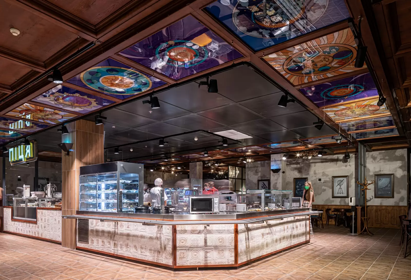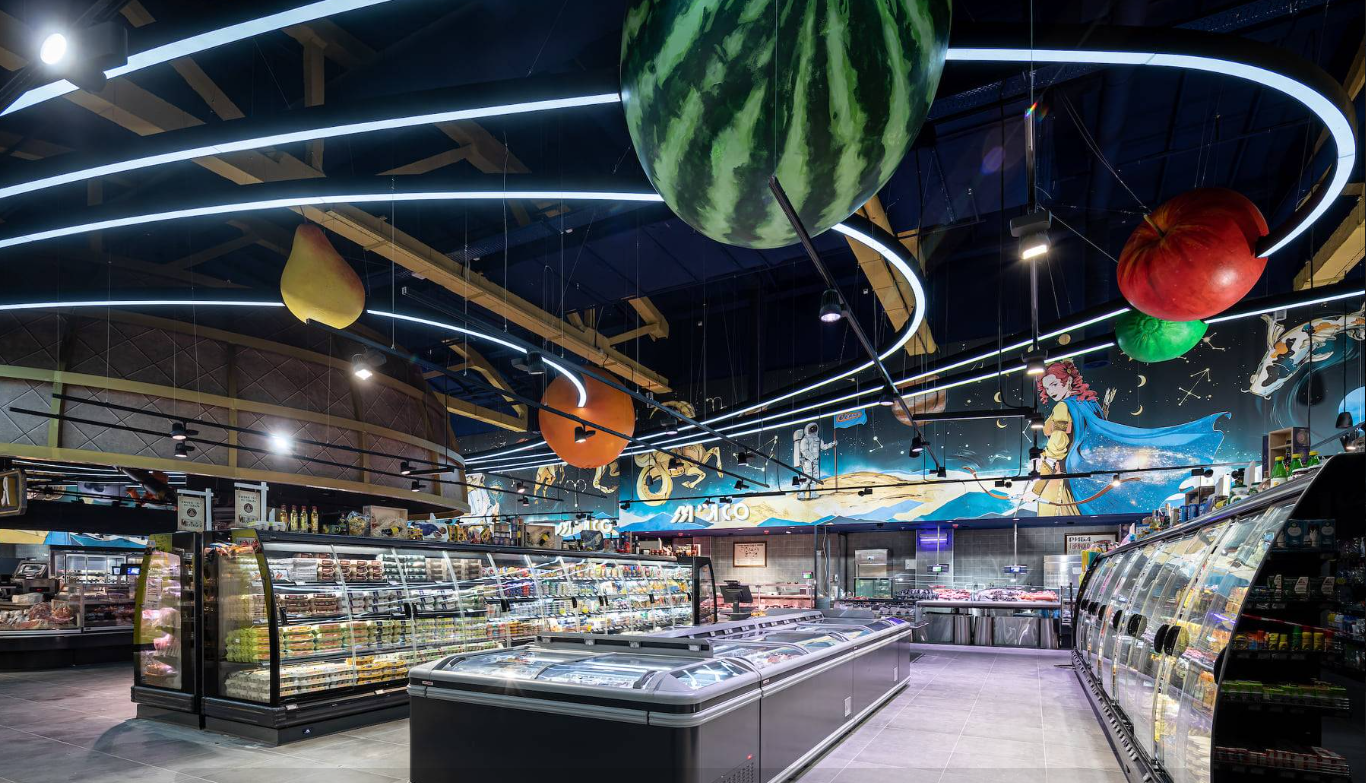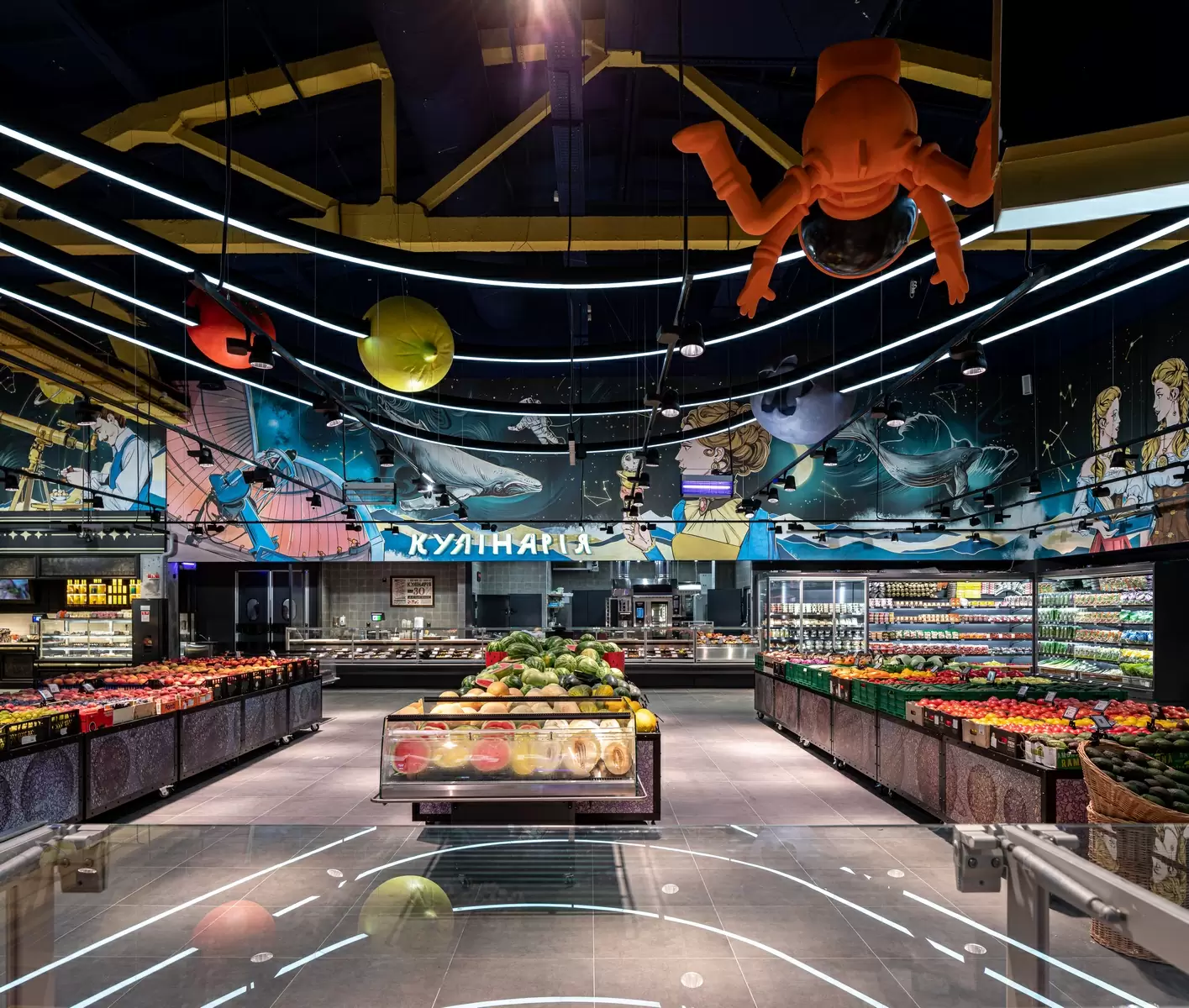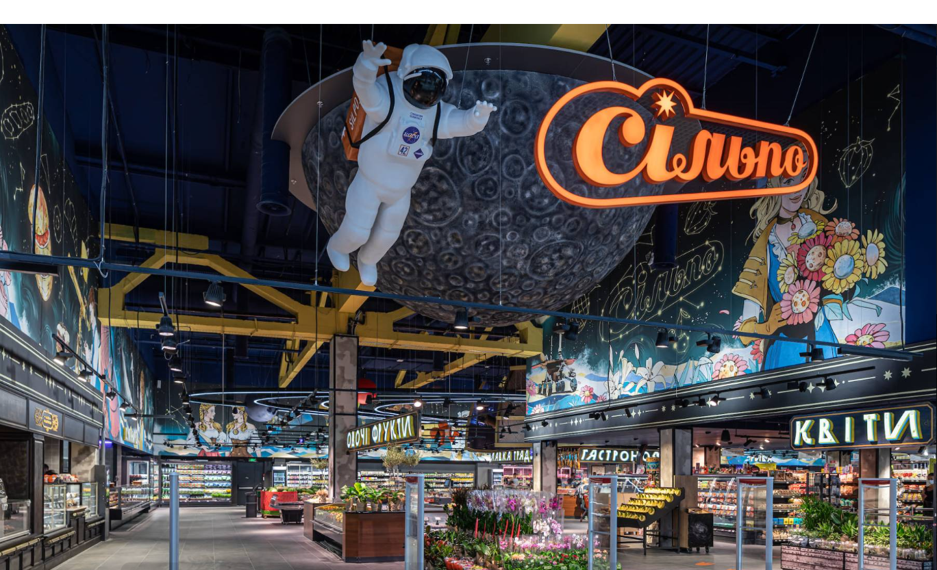 Cada uma das mais de 290 unidades possui um tema. Nessa, o supermercado ucraniano faz uma referência à astronomia. Um Sistema Solar com frutas no lugar dos planetas paira sobre a seção de hortifrúti, enquanto o açougue é iluminado pelas constelações.