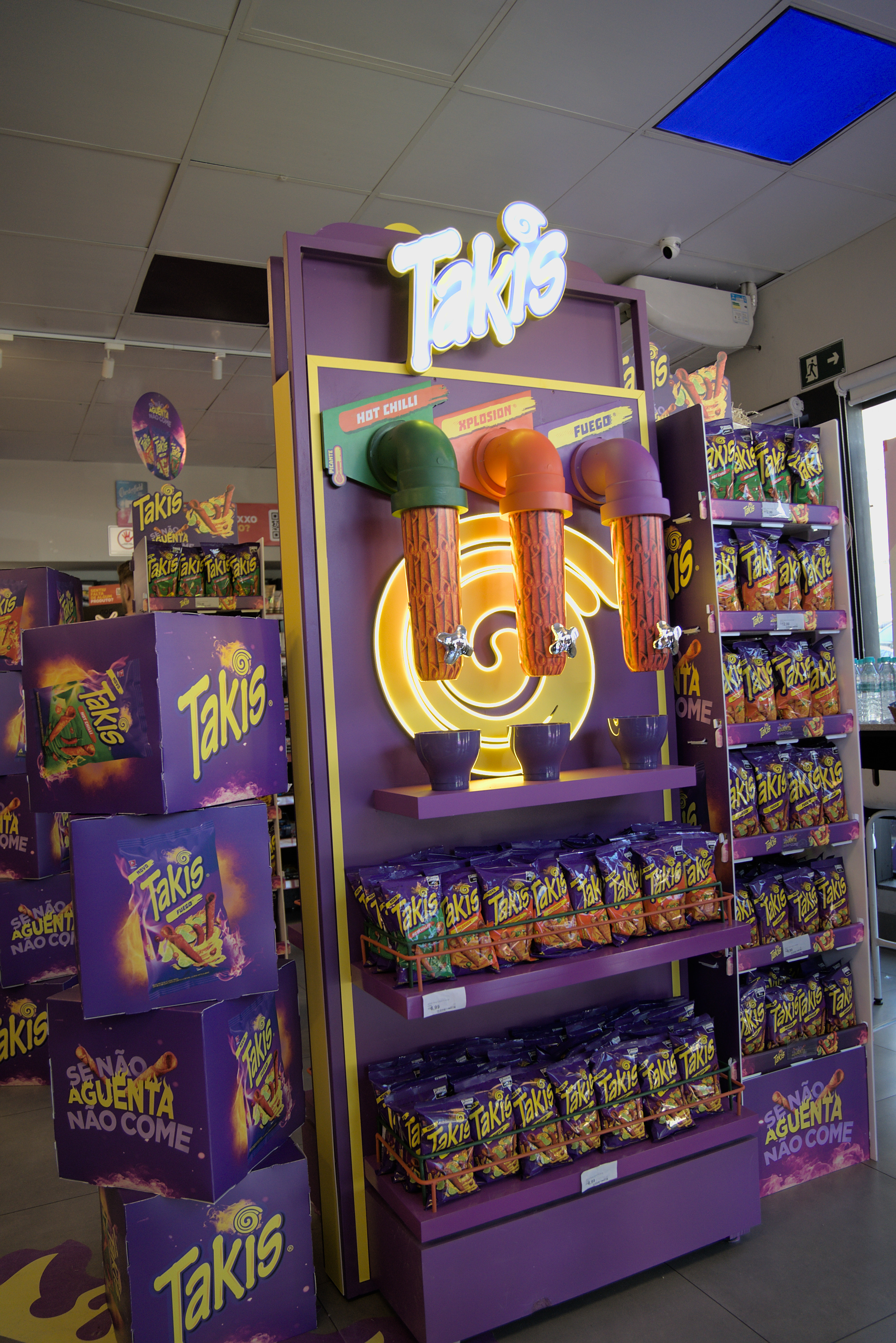 Um exemplo é o display especial com tubos transparentes com os sabores do salgadinho disponíveis para degustação gratuita diariamente.