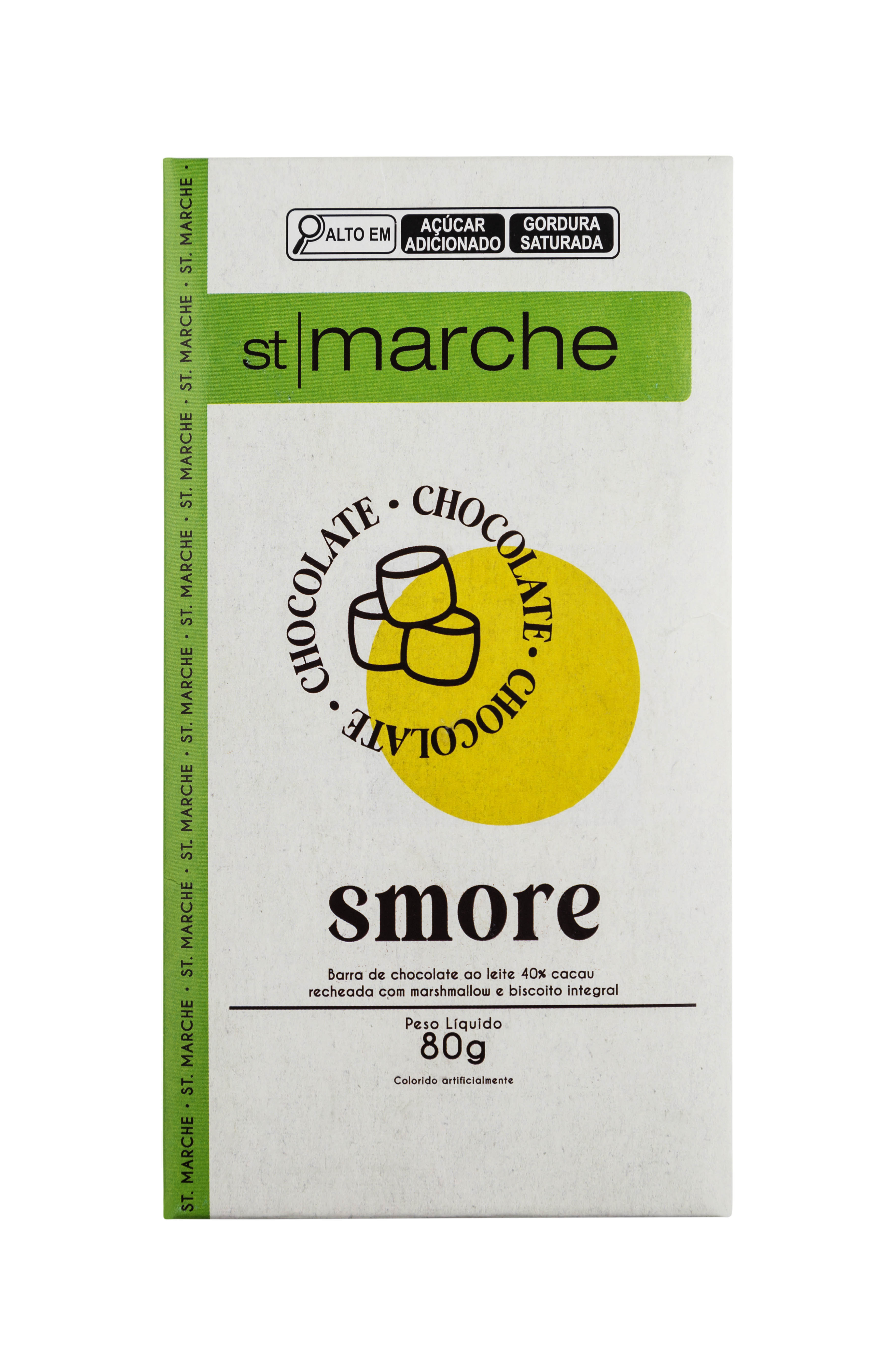 S'More: Barra feita com blend de chocolate ao leite 40% cacau, recheada com pedaços de marshmallow e biscoito integral salpicado.