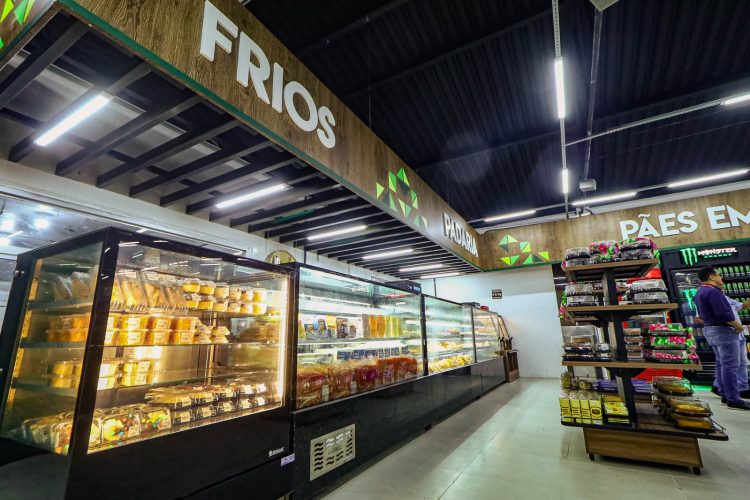 A loja ainda conta com o setor de frios ao lado do de pães embalados, uma seção de bebidas, mercearia e muito mais.